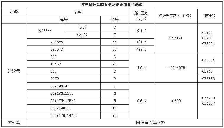 采用整体成型工艺制造的压力容器和换热器用多波(含单波)厚壁金属波形膨胀节,所选材料涵盖黑色钢、奥氏体不锈钢、双相不锈钢、镍基合金、哈氏合金、高合金钢及钛、锆、铪有色金属材料等,常用材料选择见下表。